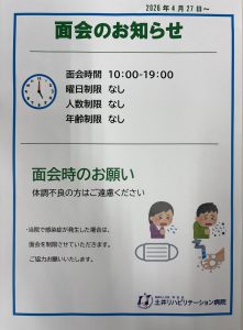 日頃より感染対策にご協力いただきありがとうございます。この度、面会に関する内容を一部変更いたします。